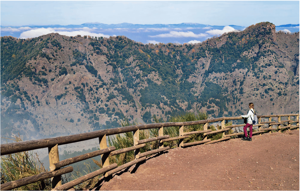 and lush woods, brooms by the bright yellow flowers and an uncanny volcanic landscape. A most spectacular drive with amazing views of the bay of Naples. After a drive of about half a mile, you will reach the top of the volcano
